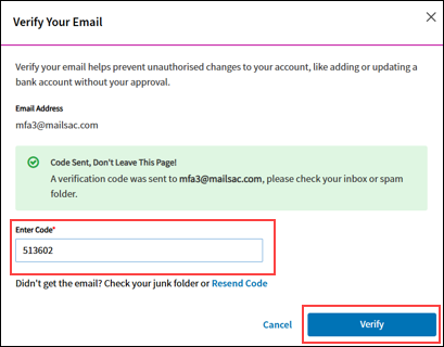 8. Enter the code in the Enter Code field and select Verify.